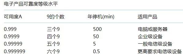 對(duì)電子產(chǎn)品而言,常用可用度n個(gè)9來描述產(chǎn)品可靠性水平。n個(gè)9表示在1年運(yùn)行中,系統(tǒng)正常使用時(shí)間與總時(shí)間之比。