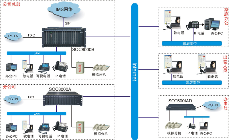Ø 分布式部署:總部各分公司、辦事處的分機,是通過IP網絡融合在一個語音平臺上來實現內部通信。總部辦事處分機出差人員的軟電話均注冊在總部的SOC8000IPPBX上,各分公司的分機注冊在本地的IP PBX或IAD上,由本地獨自管理。